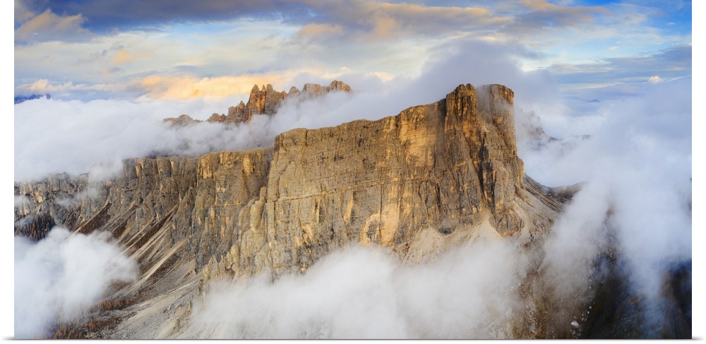 <p>Aerial view by drone of sunset over Lastoi De Formin and Cima Ambrizzola in a sea of clouds in autumn, Giau Pass, Dolomites, Veneto, Italy, Europe</p>