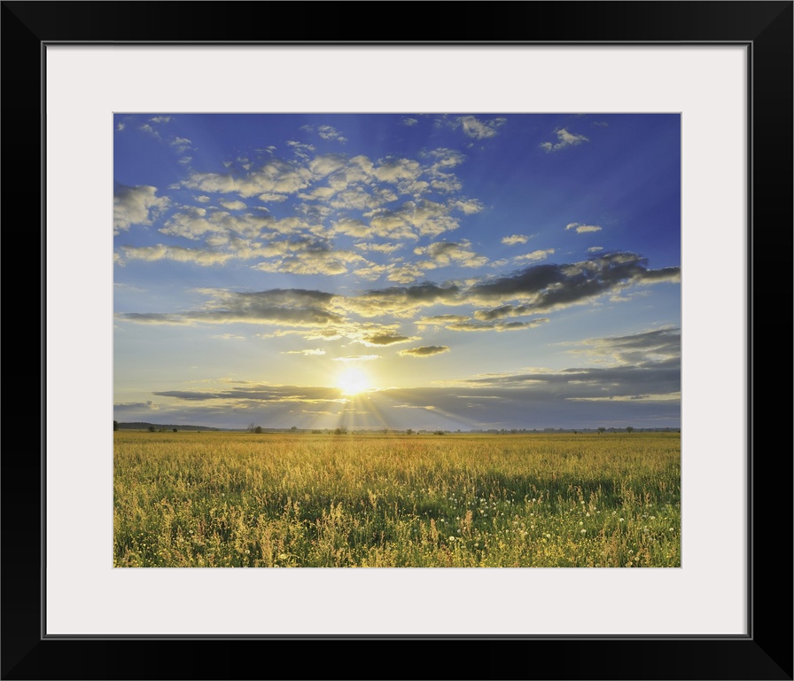 <p>Sunset over Meadow, Altmuhlsee, Gunzenhausen, Franconia, Bavaria, Germany</p>