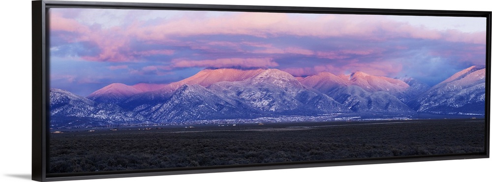 <p>Sunset over mountain range, Sangre De Cristo Mountains, Taos, Taos County, New Mexico, USA</p>