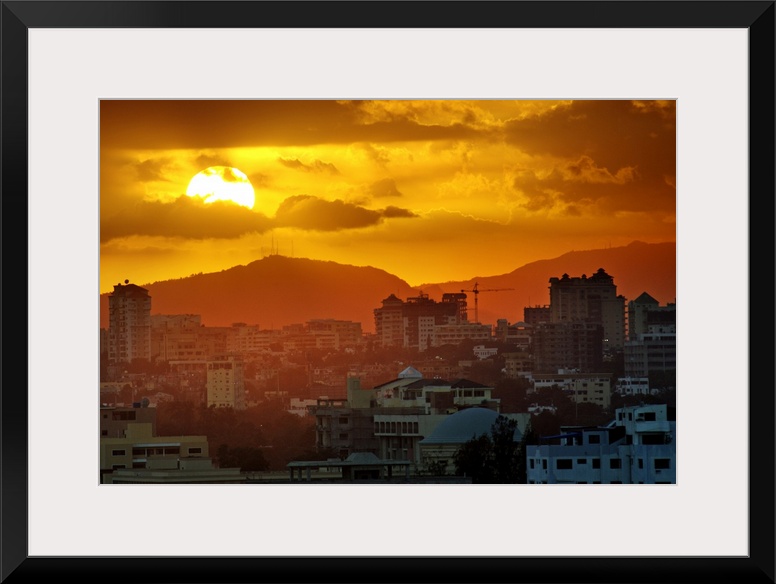 <p>Sunset, Santo Domingo, Domenican Republic, large sun, cloudy sky, orange mood, mountains in background, romantic urban scape.</p>