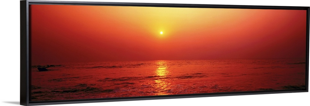 <p>Panoramic photograph taken of the sun as it begins to set in the sky. The entire picture has a warm tone to it.</p>