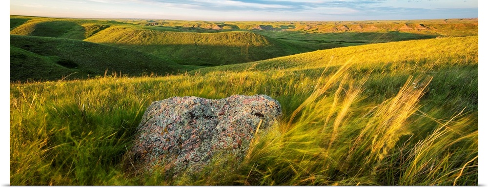 <p>Sunset Over The Coulees And Buttes Of Grasslands National Park With Erratic In Foreground; Saskatchewan, Canada</p>
