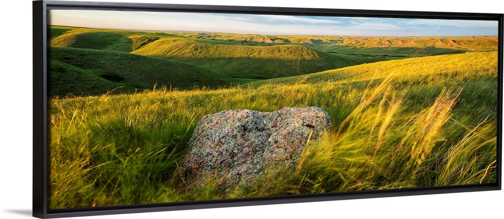 <p>Sunset Over The Coulees And Buttes Of Grasslands National Park With Erratic In Foreground; Saskatchewan, Canada</p>