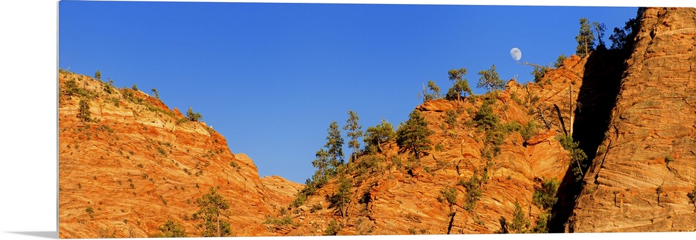 <p>The moon is visible over the edge of the orange cliffs in Zion National Park in Utah.</p>