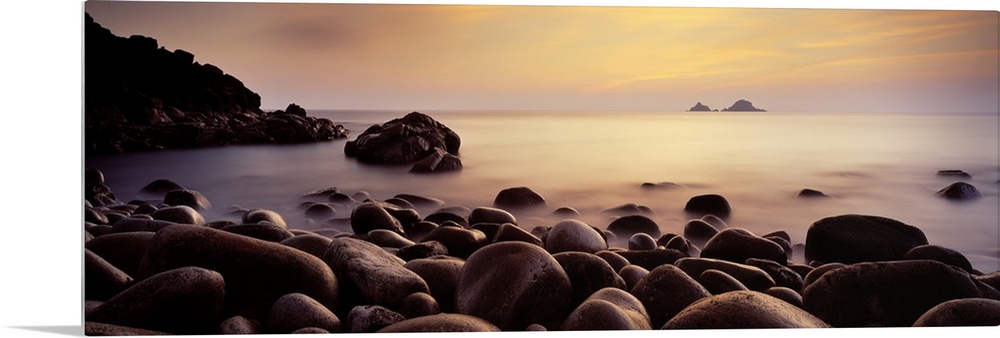 <p>Large stones create a rocky coast line in England was the sun sets over the misty Atlantic Ocean.</p>