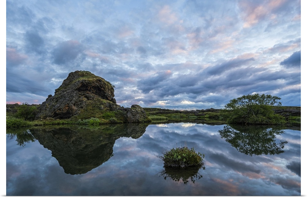 <p>Sunset over the old lava and small pond near Lake Myvatn, North Iceland; Iceland</p>