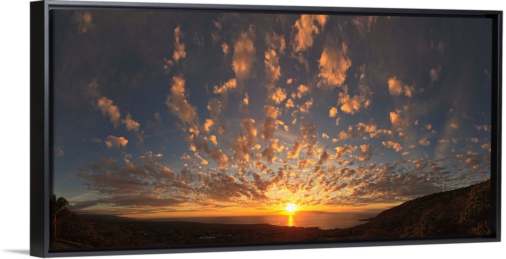 <p>Panoramic photograph taken from the coast of Kona, Hawaii of the sun setting over the Pacific Ocean, beneath a sky of small fluffy clouds.</p>