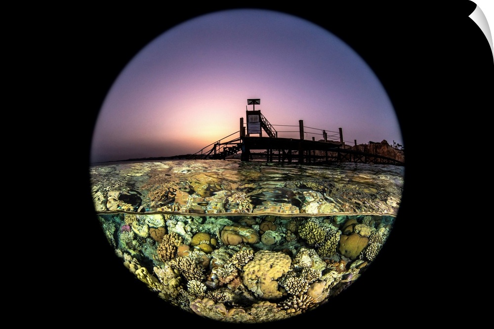 <p>Sunset over the pier and coral gardens at in the Red Sea.</p>