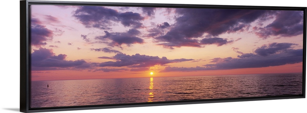 <p>Panoramic photograph taken of a sun setting over the Gulf of Mexico with warm colors throughout the sky.</p>