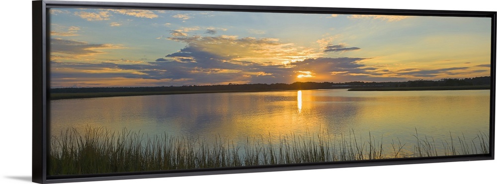 <p>Tall grass lines the bottom of this picture with a wide angle view of a body of water as the sun begins to set over it.</p>