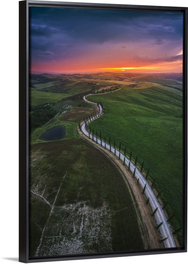 <p>Sunset over the winding road of the Podere Baccoleno in the Crete Senesi, Tuscany, Italy.</p>