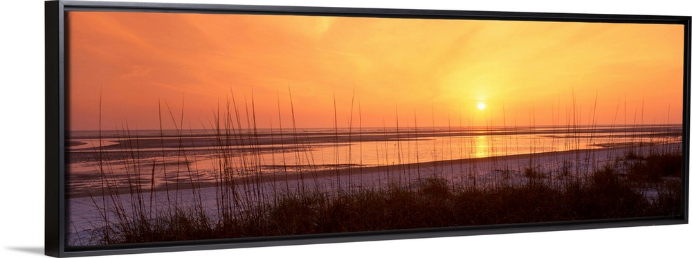 <p>Tall beach grass grows along the sandy, flat shore line and light reflects off the shallow water as the sun descends bellows the horizon in this panoramic wall art.</p>