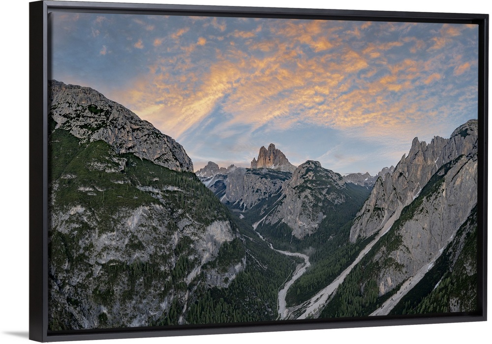 <p>Sunset over Tre Cime di Lavaredo and woods, aerial view, Sesto (Sexten) Dolomites, Bolzano province, Trentino Alto Adige, Italy, Europe</p>