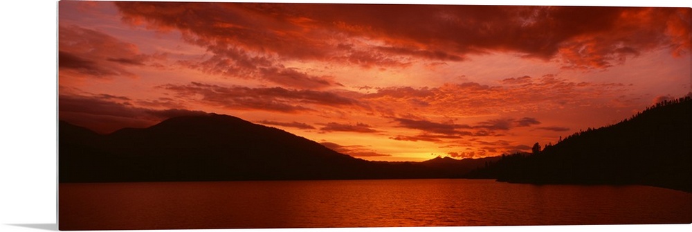 <p>Panoramic photograph of a vibrant fiery sunset over a silhouetted mountain landscape and Whiskeytown Lake in California.</p>