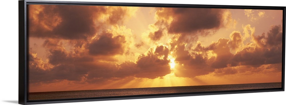 <p>Large panoramic photograph taken of a sunset behind the clouds with its rays bursting through and a vast ocean beneath it.</p>