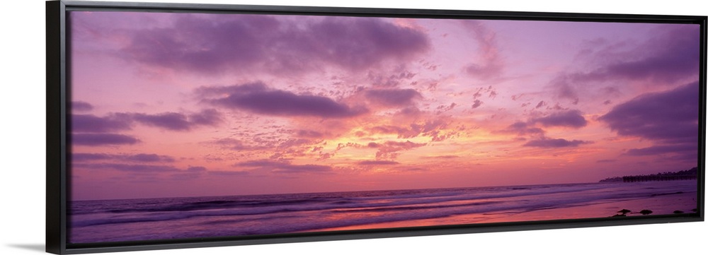 <p>Panoramic photograph of a pastel sunset over the Pacific Beach in San Diego, California, with swirling clouds in the sky.</p>