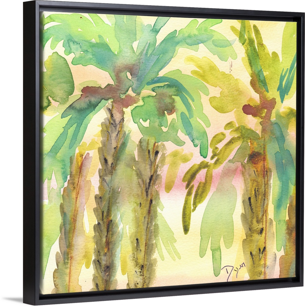 <p>Watercolor artwork of a grove of palm trees in pastel tropical shades.</p>