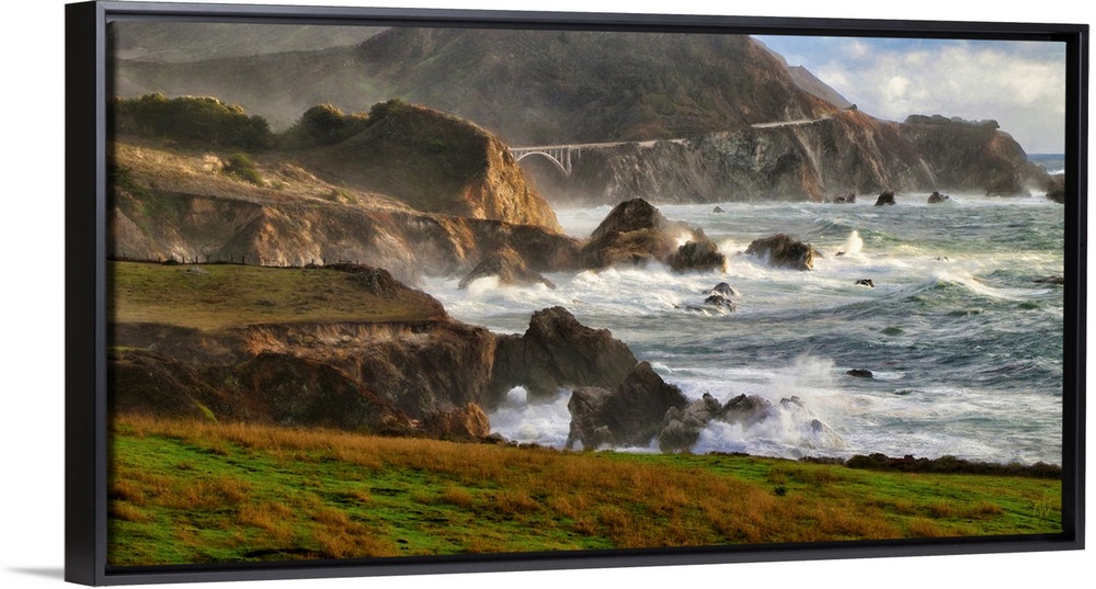 <p>A breathtaking panorama of the Big Sur coastline between Rocky Point and the distant Rocky Creek Bridge. Winter waves surge against coastal rock formations, backlit by the setting sun.</p>