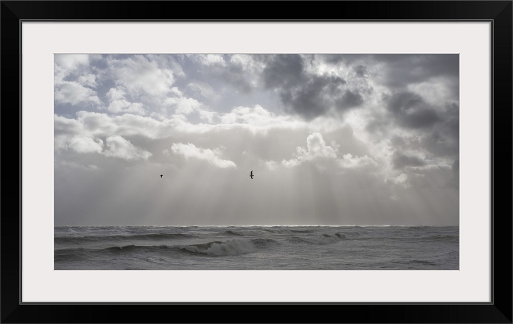 <p>Sunset rays fall over the sea with birds in flight; Greymouth, South Island, New Zealand.</p>