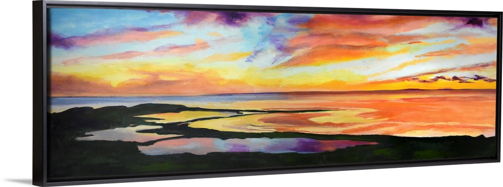 <p>Coastal scene with golden sky and reflections in the water.</p>