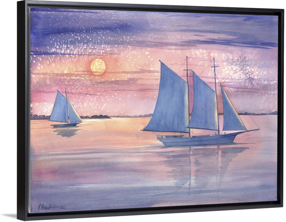 <p>Watercolor painting of two sailboats at sunset.</p>