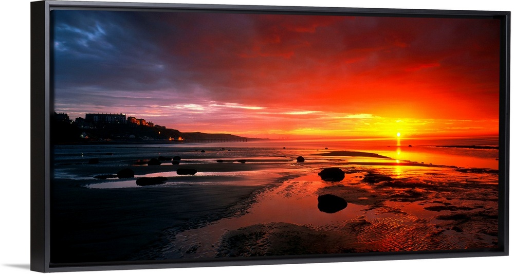 <p>Panoramic photograph that captures a colorful sunset on the shores of England. The calm beach is highly contrasted by the lively sky in the background.</p>