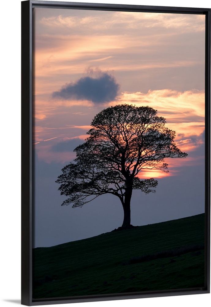 <p>Majestic lone oak tree silhouetted against a beautiful warm orange and yellow sunset of clouds on a hill.</p>