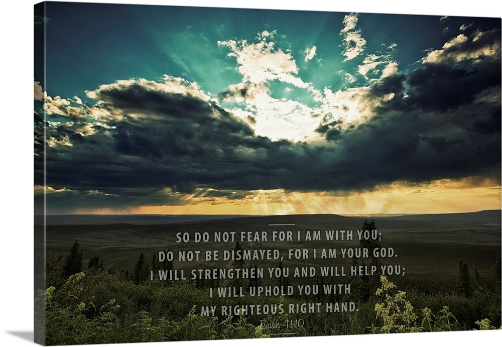 <p>Image Of A Sunset Shining Through Dark Clouds Over A Green Landscape And Scripture From Isaiah 41:10</p>