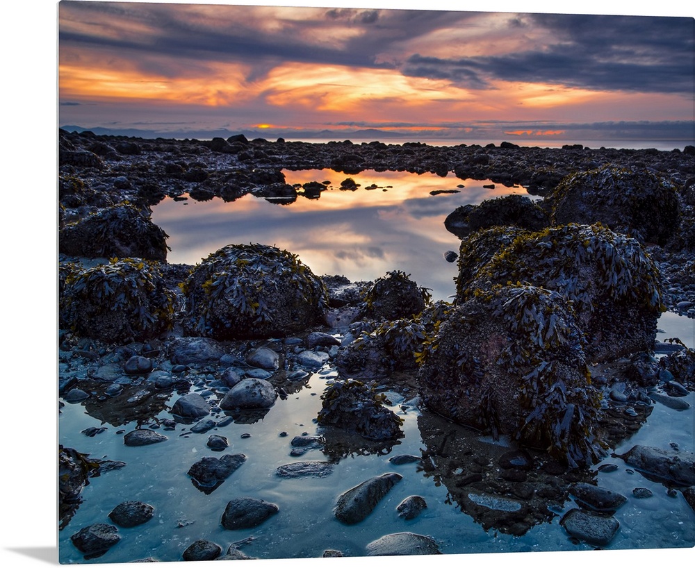 <p>Warm colours from a sunset sky reflect in the tide pools on Acadia Beach; Vancouver, British Columbia, Canada</p>