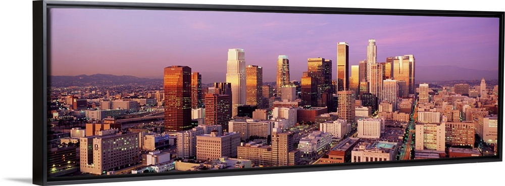<p>Giant horizontal panoramic photograph of the city of Los Angeles, California (CA) as the sun begins to set and its rays shine off the skyscrapers.</p>