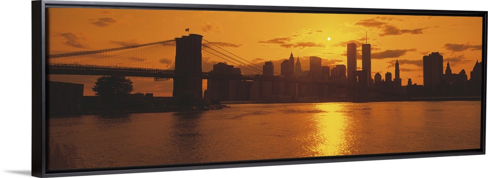 <p>This wall art for the home or office is a panoramic photograph of the Manhattan skyline silhouetted in the evening light.</p>