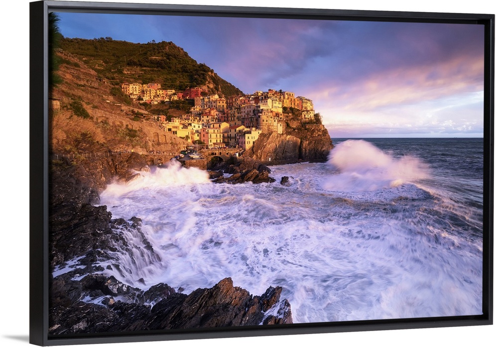 <p>Dream sunset during a storm over the village of Manarola, Cinque Terre National Park, municipality of Riomaggiore, La Spezia province, Liguria district, Italy, Europe. Liguria, Western Europe, Italy.</p>