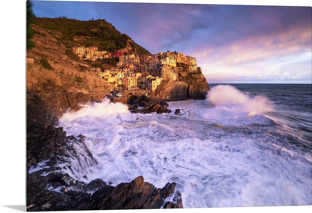 <p>Dream sunset during a storm over the village of Manarola, Cinque Terre National Park, municipality of Riomaggiore, La Spezia province, Liguria district, Italy, Europe. Liguria, Western Europe, Italy.</p>
