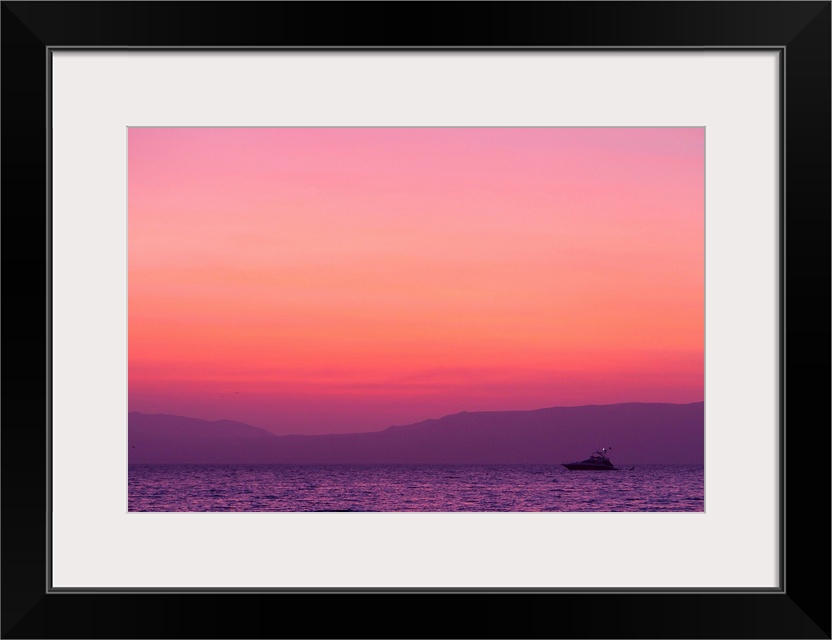 <p>Sunset turns the sky pink and purple as a lone boat floats offshore.</p>
