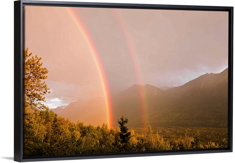<p>A double rainbow from a passing summer evening storm in Eagle River Valley is illuminated by the setting sun in Southcentral Alaska. Summer. Evening.</p>