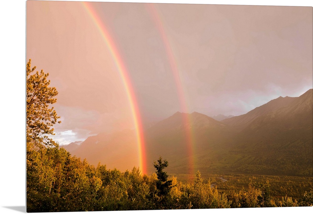<p>A double rainbow from a passing summer evening storm in Eagle River Valley is illuminated by the setting sun in Southcentral Alaska. Summer. Evening.</p>