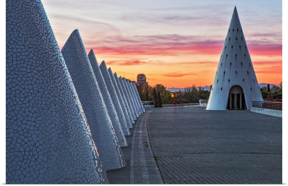 <p>Sunset view of the Umbracle adjacent to the El Palau de les Arts Reina Sofia, located in the City of Arts and Sciences, Ciutata de les Arts i les Ciencies, Valencia, Spain.</p>