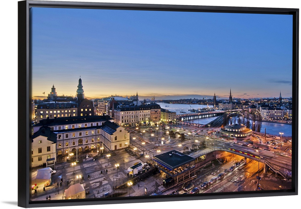 <p>This is a view over Slussen which is the main traffic central of the island of Sdermalm. The green and red subway lines split up in two direction, a buss central for commuters going east and a unique traffic carousel solutions for cars that was inaugurated in 1935. This is also where the lake of Mlaren meets the salt lake and the inner archipelago of the Baltic Sea. On the other side of the canal you find the Old Town. The square in the middle is Sdermalmstorg, where you fint the city museum of Stockholm to the left. The small cube hanging out over the road is a restaurant.</p>