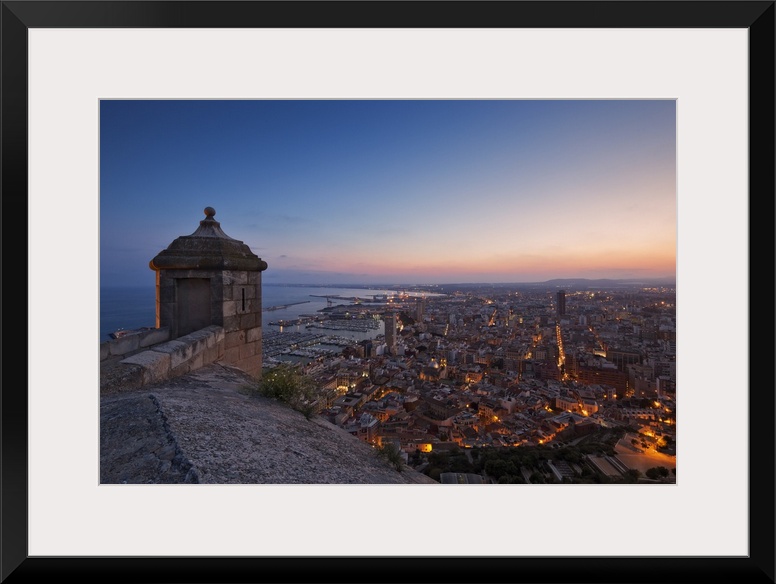 <p>Sunset view over the cityscape of Alicante looking towards the lookout tower and Port of Alicante from Benacantil Mountain and Santa Barbara Castle in Ensanche Diputacion, Alicante, Valencian Community, Spain.</p>