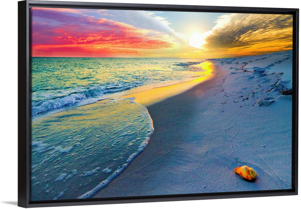 <p>A shell on a sandy beach before a colorful sunset. A very tranquil and relaxing sunset. Landscape taken on Navarre Beach. Florida.</p>