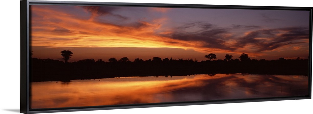 <p>Panoramic photo on canvas of a bright sunset along a river in Africa with a tree line silhouetted against the sky.</p>