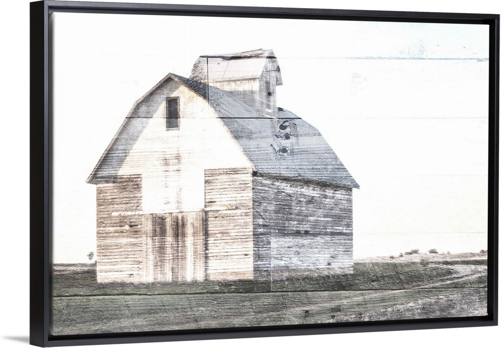 <p>An image, in neutral tones, of a barn on top of wood planks.</p>