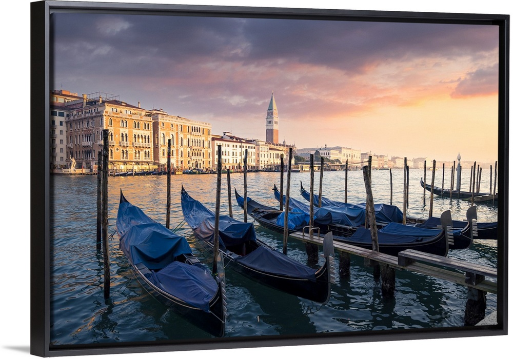 <p>Sunset with gondolas and St. Mark belltower. Venice, Veneto, Italy.</p>