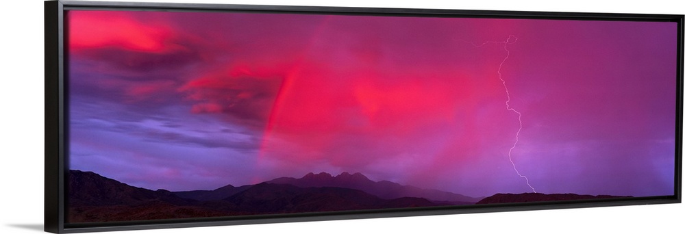 <p>This panoramic photograph is taken of a sunset sky that is highlighted with hot pink and a bolt of lightning is striking down and hitting the mountainous terrain below.</p>
