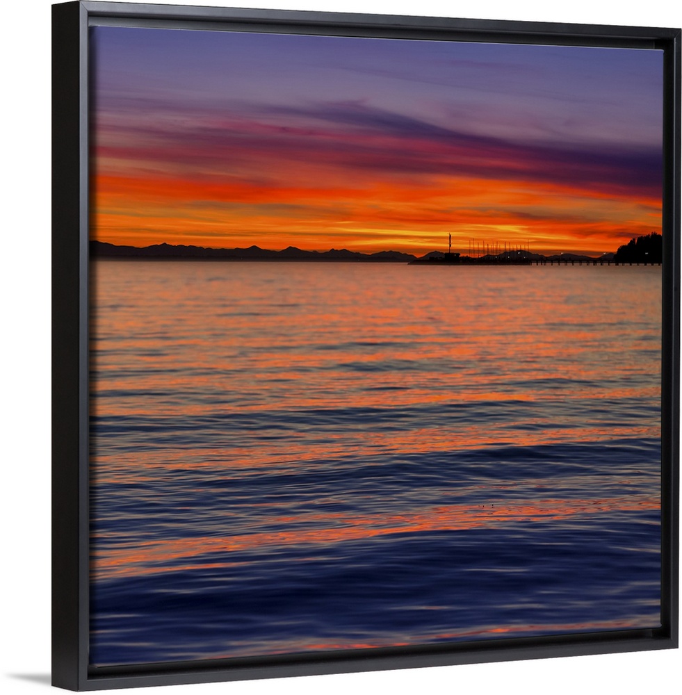 <p>Dramatic and vibrant sunset with a silhouetted coastline; Whiterock, British Columbia, Canada</p>