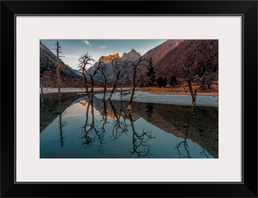 <p>Sunset with trees reflected in a high altitude lake on the Tibetan Plateau, Rilong, Sichuan Province, China</p>