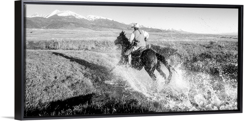<p>Action photograph of a cowgirl splashing across a river on horseback with snow capped mountains in the distance.</p>
