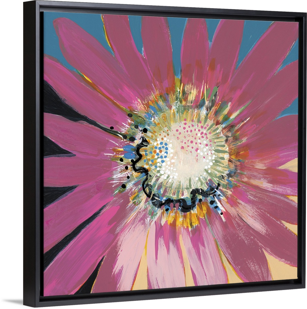 <p>Square contemporary painting of a large blooming flower with textured colors of pink, yellow and blue.</p>