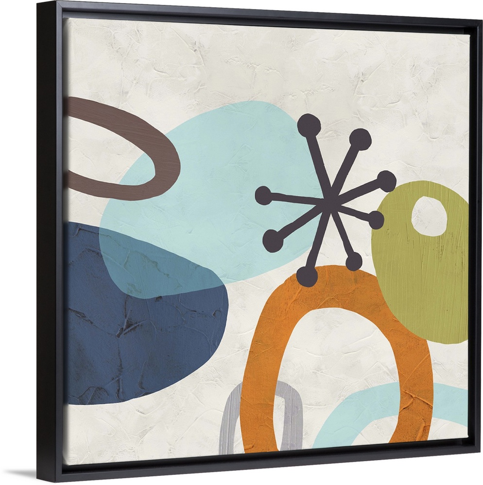 <p>Contemporary abstract painting using organic funky shapes in muted colors against an off-white background in a retro style.</p>