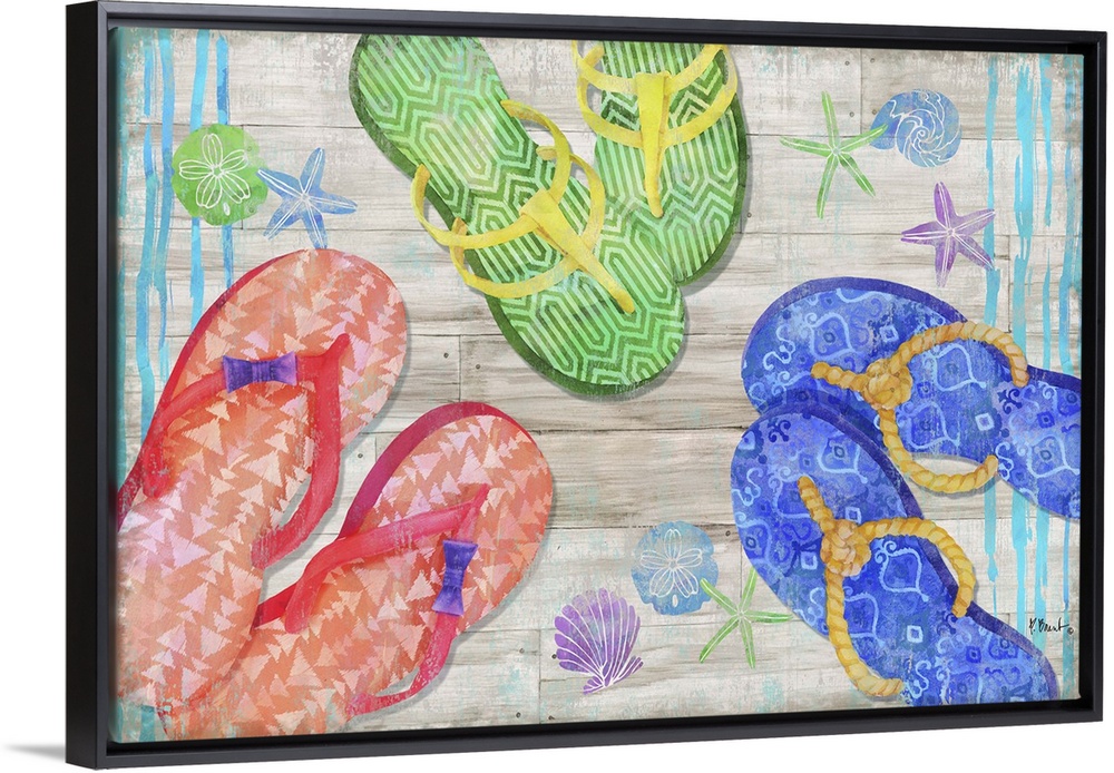 <p>Large Summer themed decor with colorful flip flops and seashells on a faux wood background.</p>